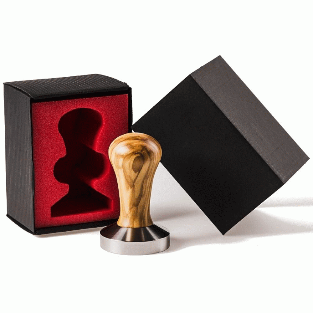 'Espresso Pro tamper. Luxe uitvoering in echt Itlaiaans olijfhout. Ongelakt, matte polish; ligt super in de hand. Natuurproduct met afwijkingen in de tekening. Ideale tamper, houten handvat, platte basis. Zwaar uitgevoerd. De 53mm basis is geschikt voor La Spaziale espressomachines. De 58mm basis is geschikt voor de Lelit Bianca en de Lelit Mara.' In luxe geschenkverpakking, ook leuk om weg te geven of te krijgen natuurlijk!'
